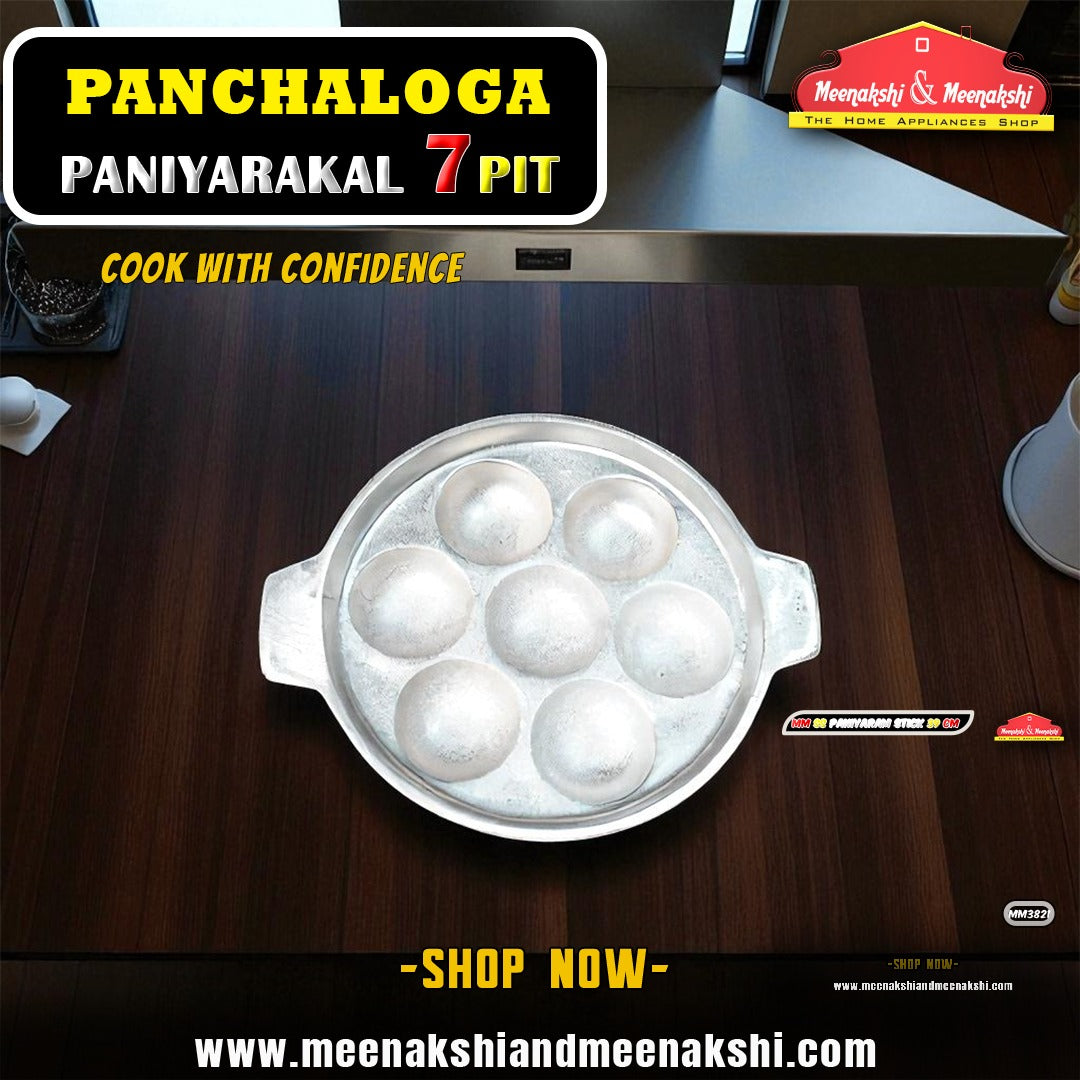 Panchaloga Panniyarakal with seven pits, crafted from traditional five-metal alloy (panchaloga) for authentic spiritual rituals. This traditional cooking vessel features precisely designed compartments ideal for preparing panniyaram—the beloved South Indian sweet delicacy. The durable metal construction ensures even heat distribution and longevity. Perfect for both ceremonial use and everyday kitchen needs, this panniyarakal combines heritage craftsmanship with functional excellence. An essential addition to any traditional Indian kitchen.